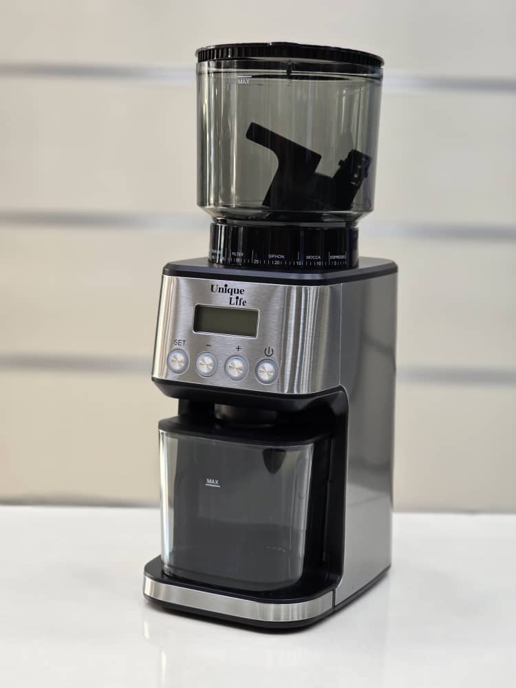 آسیاب قهوه یونیک لایف مدل UL-CG019s صفحه دیجیتال شات زن تایمردار حالت push to grinde صفحه دیجیتال مشکی سیلور سفید هوپر قفلدار هولدر سایز51 تا 58 هوپر 500 گرمی دان قهوه سیلور و مشکی و سفید تیغ تیتانیوم